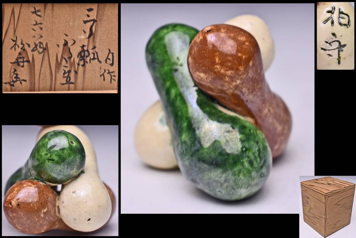 > 柏守 在銘 ★ 自作 色絵 三ツ瓢 蓋置 ★ 共箱 ★ 茶人の作か ★ 吉祥 縁起物 ★ 茶道具 ★