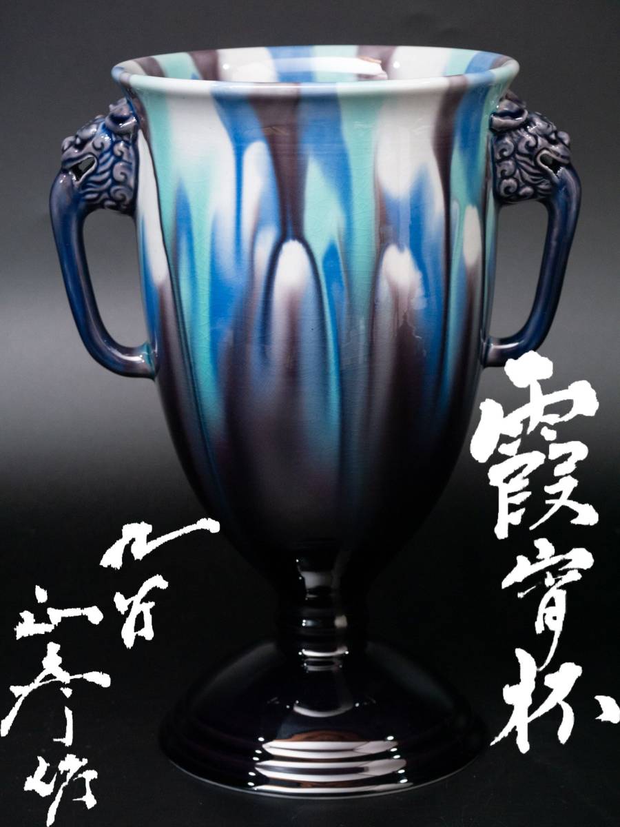 - 【値下げ交渉有り】 希少 人間国宝 三代 徳田八十吉 徳田正彦 造 彩釉 耀彩 獅子頭二耳 霞宵杯 トロフィー カップ 台付 共箱