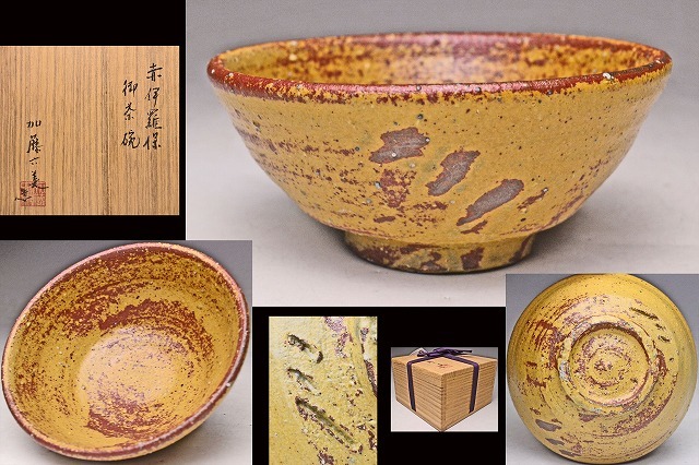 - 加藤六美 ★ 赤伊羅保 茶碗 ★ 共箱 ★ サインと同じ柄 ★ 数寄者の茶道具