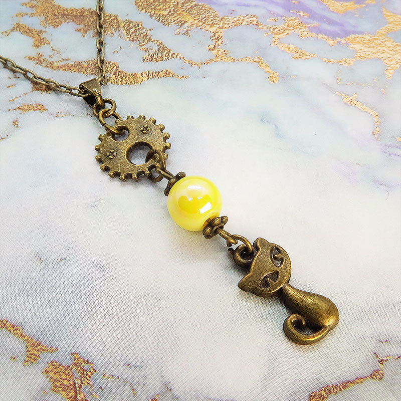 - アンティークカラーの猫と歯車のシンプルで可愛いネックレス イエローカラービーズ スチームパンク風