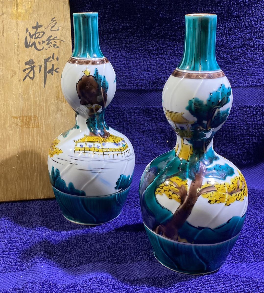 - 九谷焼 三ツ井為吉作 色絵 山水徳利 2客 共箱 智