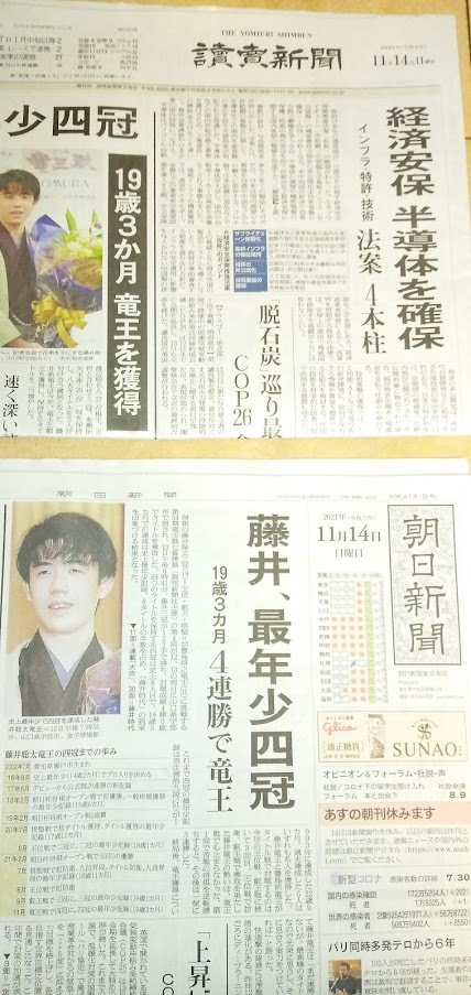 > <7冠へ>藤井聡太 棋聖1冠・王位2冠・叡王3冠・竜王・王将そして棋王 朝日新聞・読売新聞・産経新聞の3紙+スポーツ紙