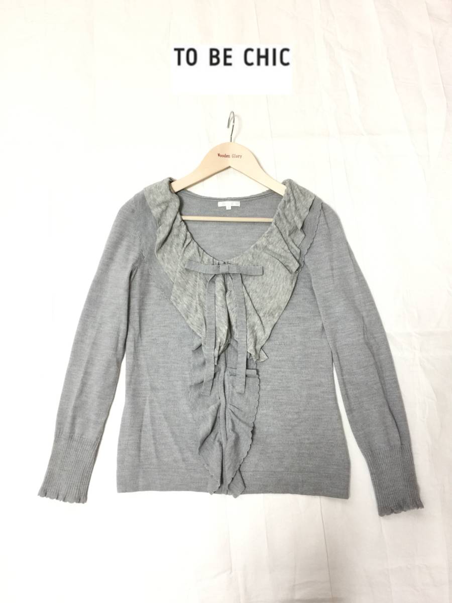 > トゥービーシック TO BE CHIC グレー リボン フリル カーディガン トップス カットソー II 2 ウール混 毛 レディース スナップボタン