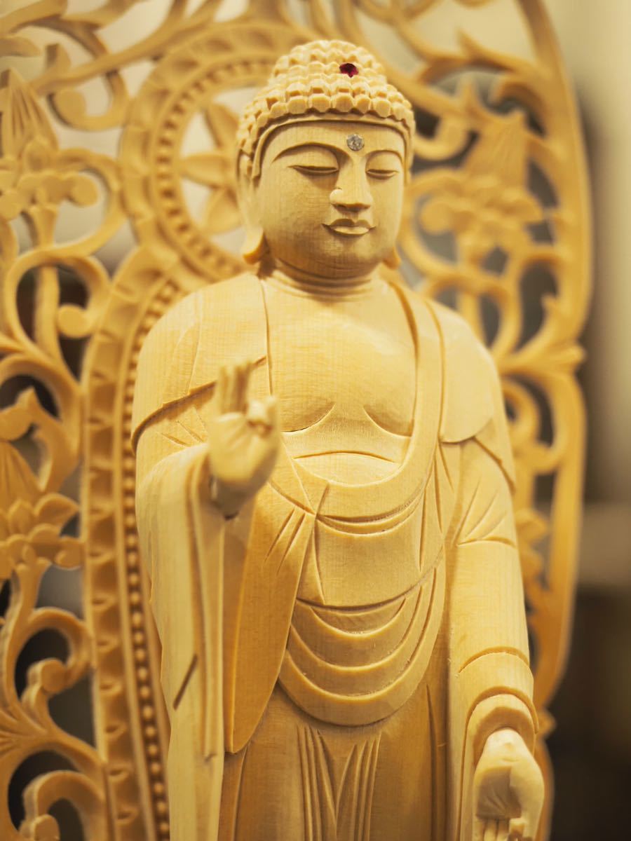 - 新品未使用 舟立弥陀 5寸 六角台座 浄土宗 桧 木彫 仏像 仏教美術 阿弥陀如来