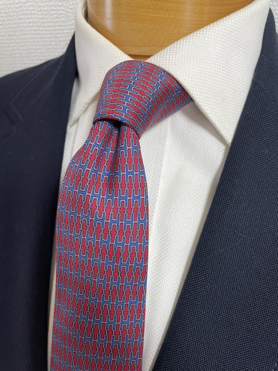 - 【美品】エルメス フランス製ネクタイ 大剣約8.5cm ブルー×レッド パープルプリント HERMES 高級シルク
