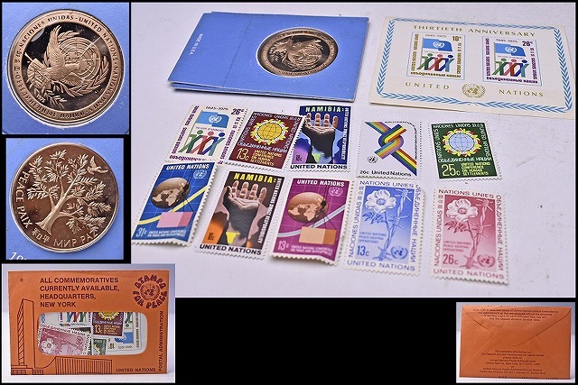 > 国際連合 記念メダル 切手セット ★ 1975年 ★ 切手10枚2枚シート 1枚 記念メダル1点 ★ UNITED NATIONS ★