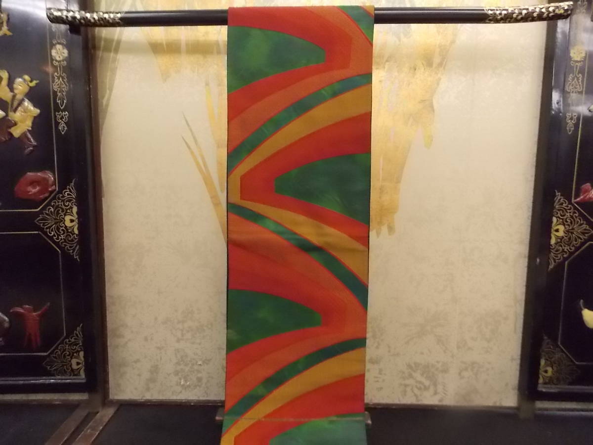- きもの今昔3167 袋帯 西陣織纐纈織 グリーンの引き箔以外の部分がふくれ織 高級カジュアル帯