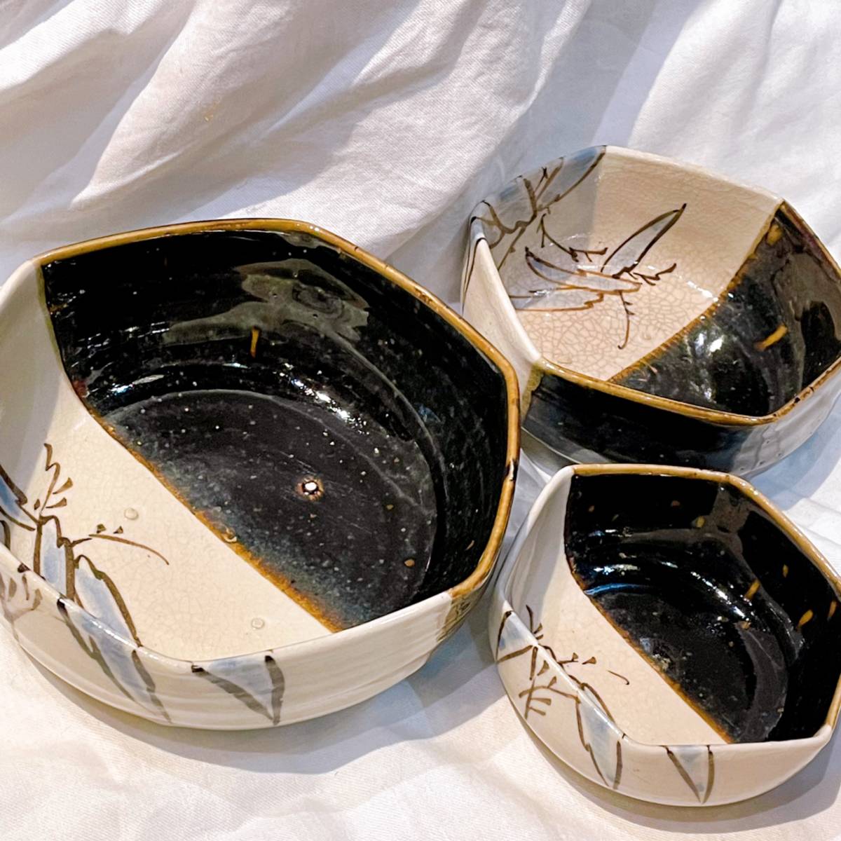 - 陶器 六角形 深皿 3枚セット! 角皿 盛鉢 ボウル 盛り皿 和食器 皿 インテリア 骨董 飾皿 茶器 お抹茶 割烹 アンティーク ビンテージ 昭和