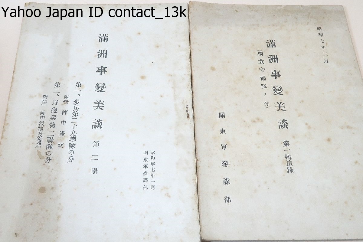 - 満州事変美談・独立守備隊の分/歩兵第二十九連隊の分・陣中漫談・野砲兵第二連隊の分・陣中漫談及逸話/2冊/関東軍参謀本部/昭和7年