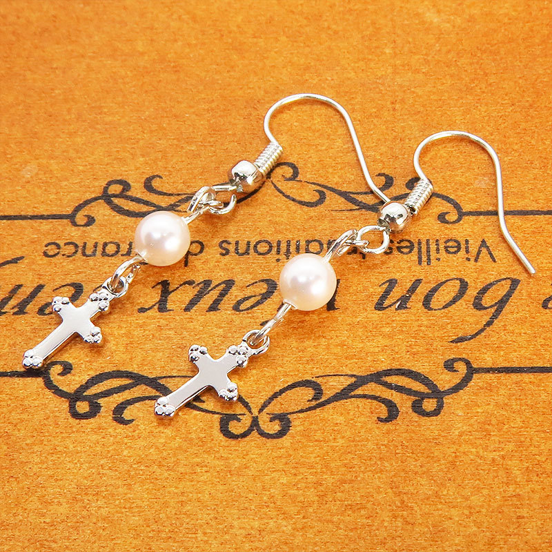 - シルバーカラー ロザリオ(十字架)とスワロフスキーパール(クリスタルホワイト)のコンパクトなピアス サージカル可