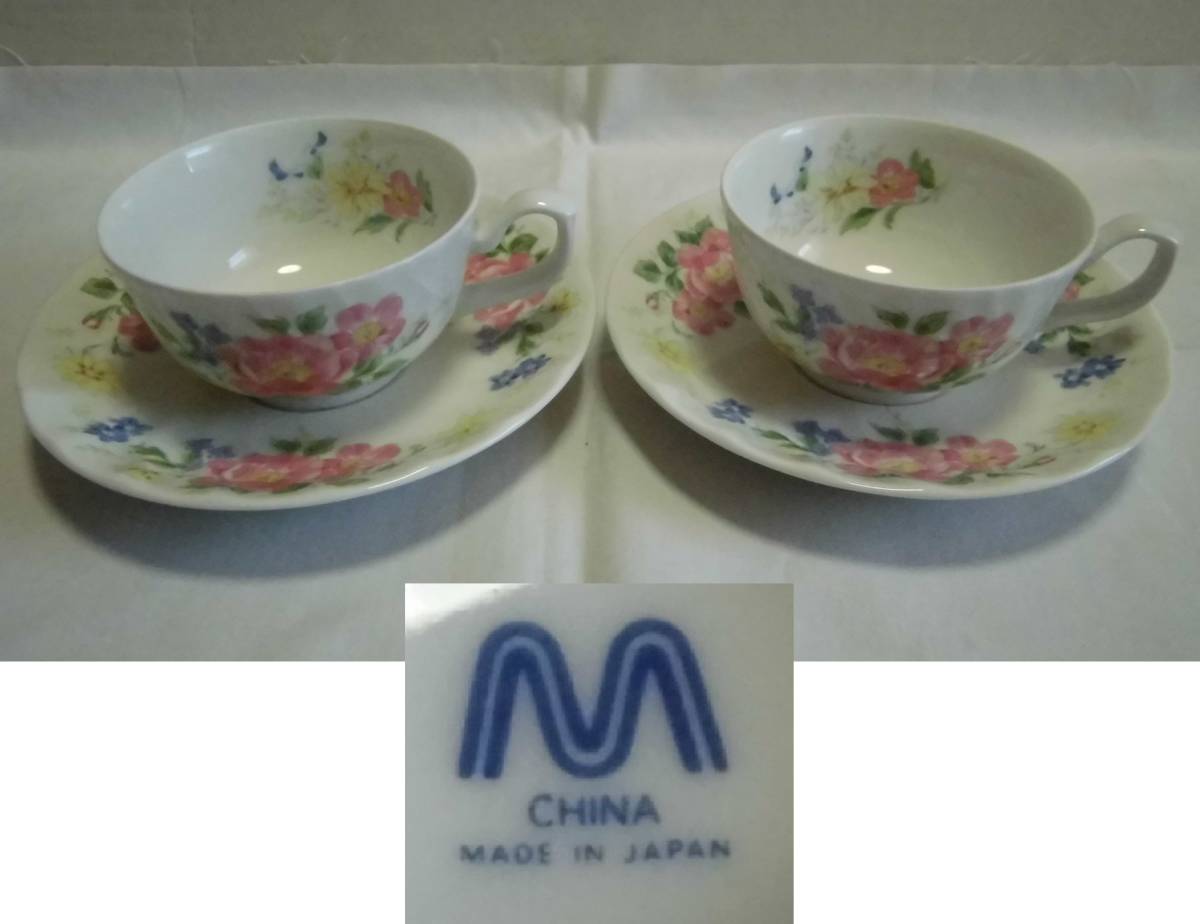 - カップ&ソーサー M CHINA 2客 花柄 色絵 ティーカップ コーヒーカップ 工芸品 茶器 陶器 レトロ アンティーク