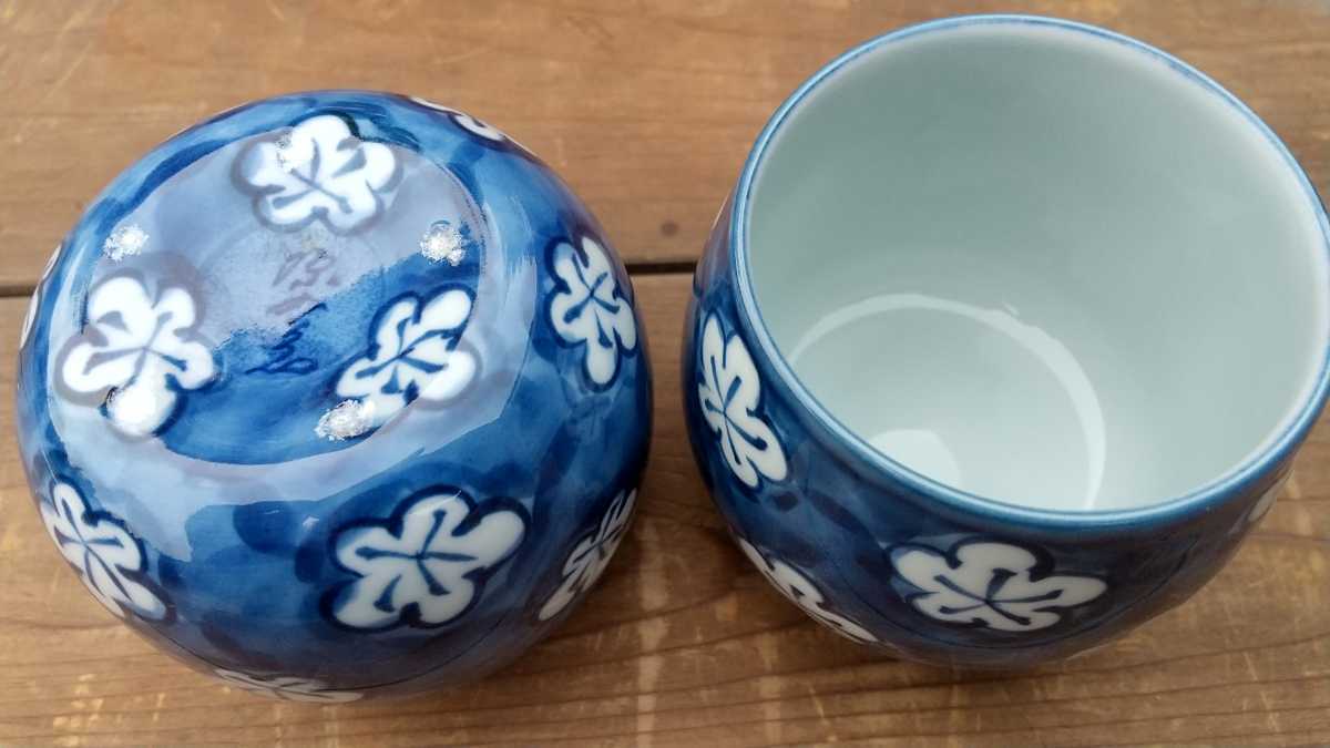 - 源右衛門窯 古染風梅紋 湯呑 二個 共箱 サイズ(口直径6㌢胴直径7㌢底直径5㌢重さ100㌘) 廃盤品 美品