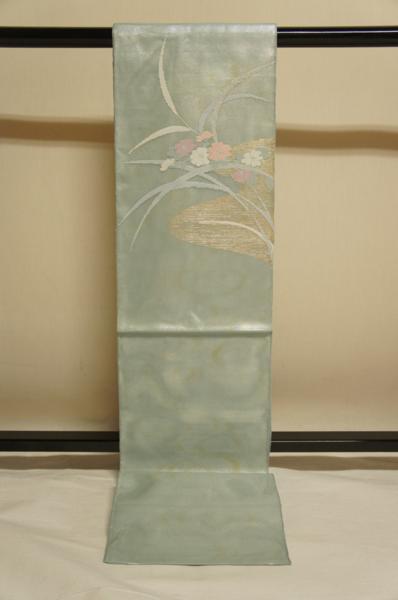 > 特選三重紗うす水色引箔金糸流水草花模様未着用袋帯O9258