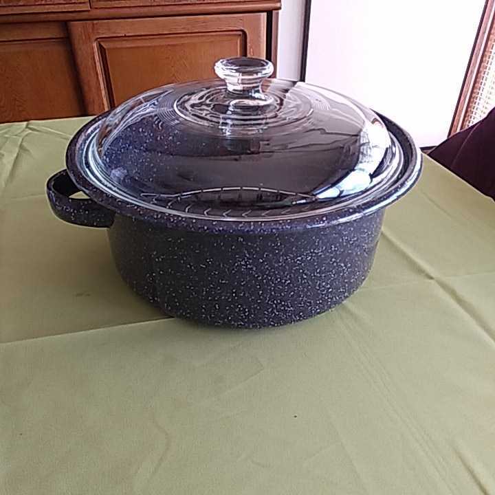 - 「両手鍋 」ホーロー鍋、蓋強化ガラス、底敷網、鍋底には水切りがあります