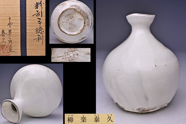 > 柳楽泰久 ★ 粉引手徳利 ★ 共箱栞 ★ 水色の透明釉もキレイ ★ 純白な 粉吹 ★ 物故作家 ★ 釉薬のスペシャリスト