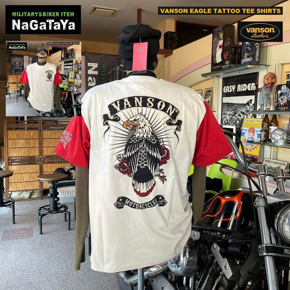 > VANSON バンソン NVST-2208 BIKE EAGLE TATTOO TEE SHIRTS イーグル タトゥー刺繍 Tシャツ ナチュラル×レッド Lsize メンズ BIKER