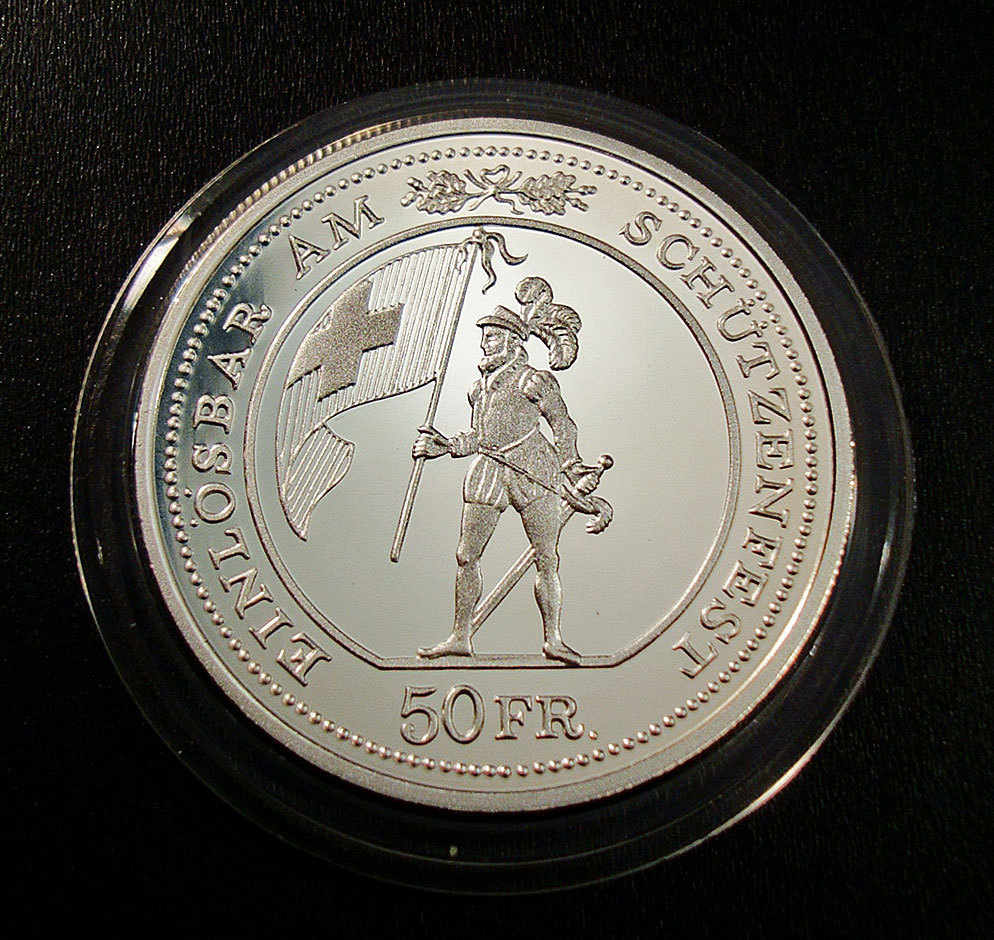 - ●スイス 1993年 現代射撃祭 ツルガウ 50フラン銀貨 プルーフ