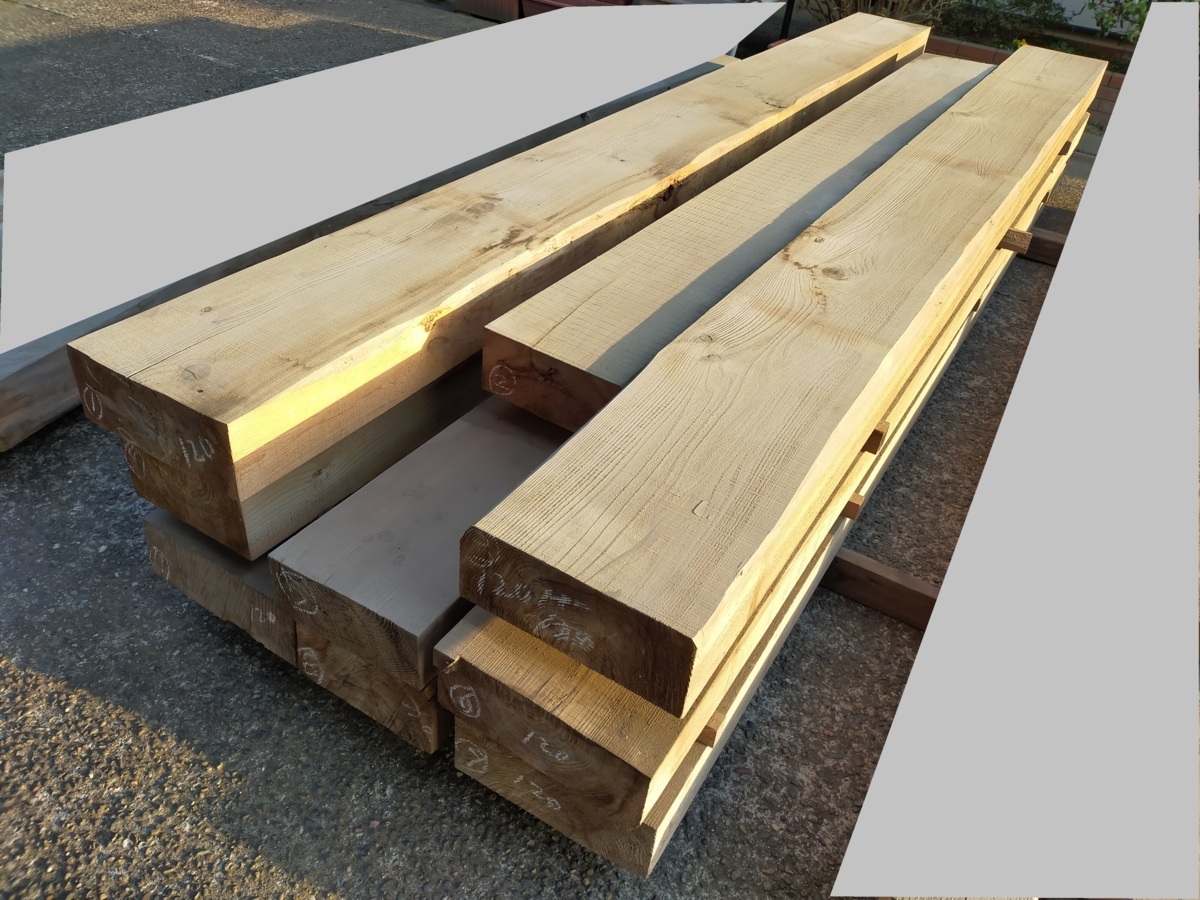 - 【配送制限有り・引取歓迎】杉 平角 9本まとめ売り 役物 厚13~15cm、幅29.5~39cm、長さ4m ※1本だけ3m 無節上小節/梁/乾燥/長期保管