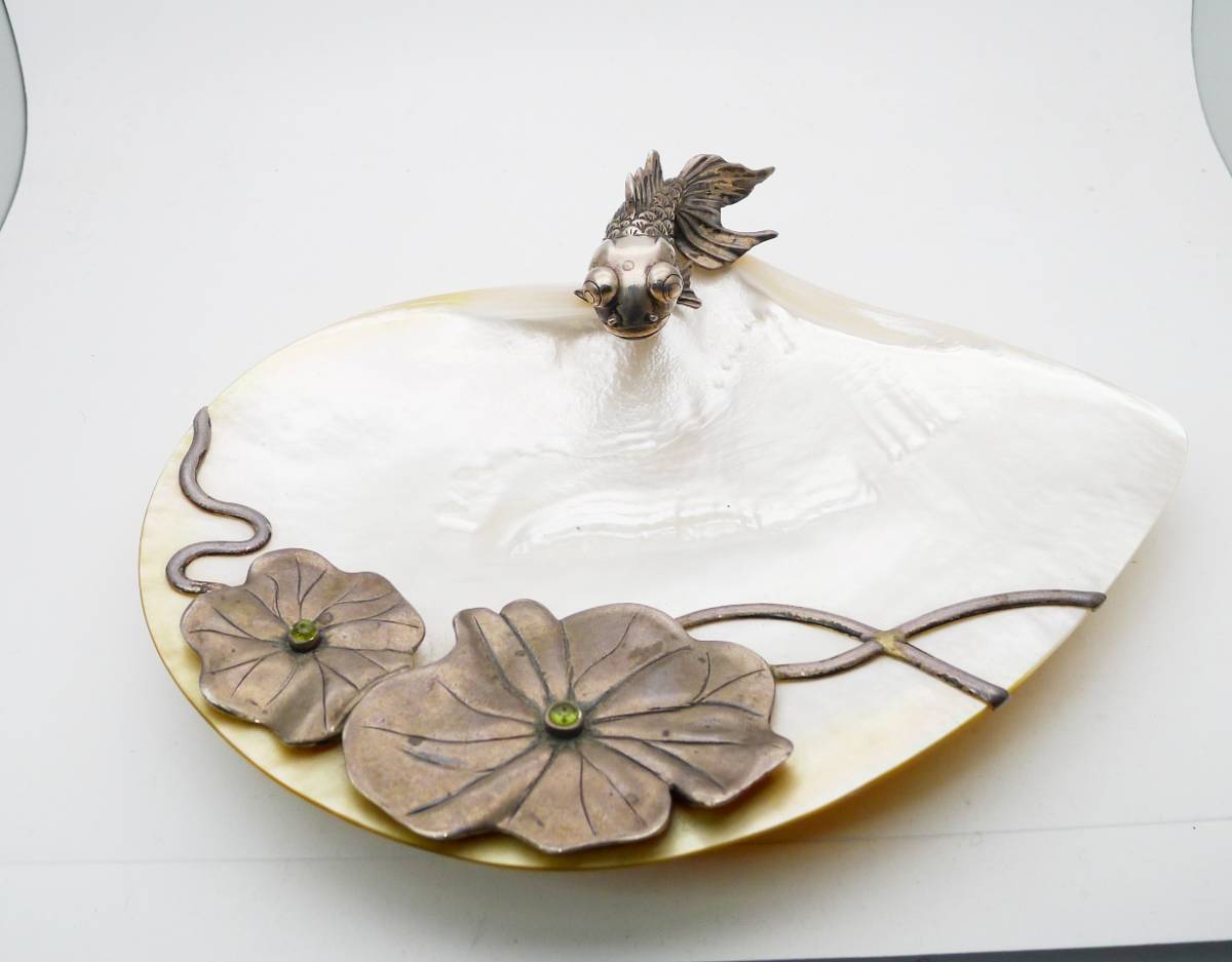 - ★シェル皿/シルバー925金魚・グリーンストーン入蓮の花 置物 美術品