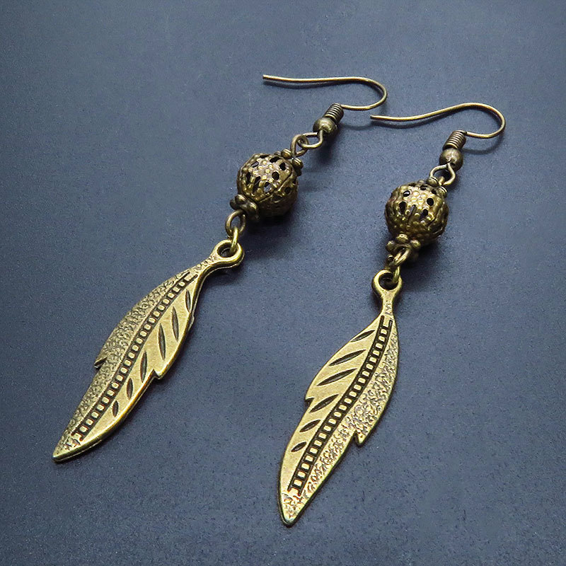 - アンティークゴールド フェザーとメタルビーズのピアス 金古美色 シンプル コンパクト
