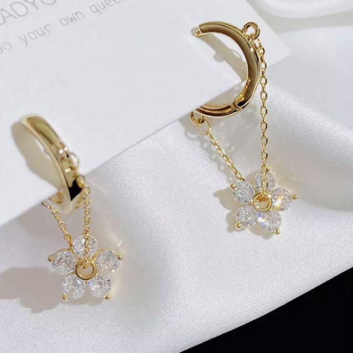 - フラワーピアス 花 ゴールド ジルコニア レディース チェーン 韓国 アレルギー対応 キラキラ おしゃれ シルバー925 新品