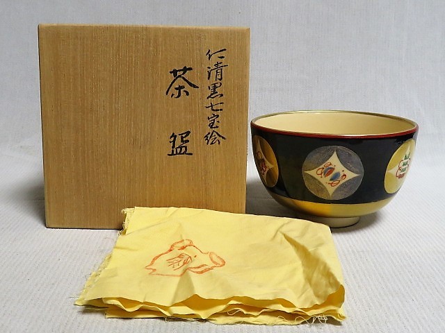 - 茶道具 陶楽造 仁清黒七宝絵茶碗 共箱 NO.1307
