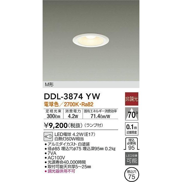 > ★DAIKO★ダイコー DDL-3874YW LEDダウンライト 埋込穴75 電球色 電球付 50/60Hz 100V 非調光 天井埋込 電工 電設 改修 改装 リフォーム