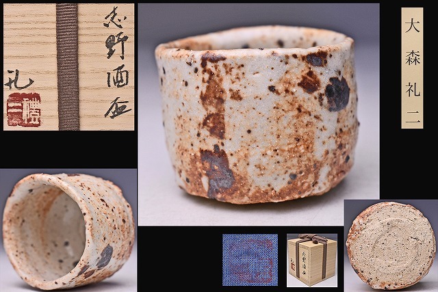 - 大森礼二 ★ 志野 ぐい呑 ★ 共箱 共布 栞 ★ 師: 加藤春鼎 ★ 作行の素晴らしい逸品 ★ 絵志野 盃 杯 ★ 酒器 ★6