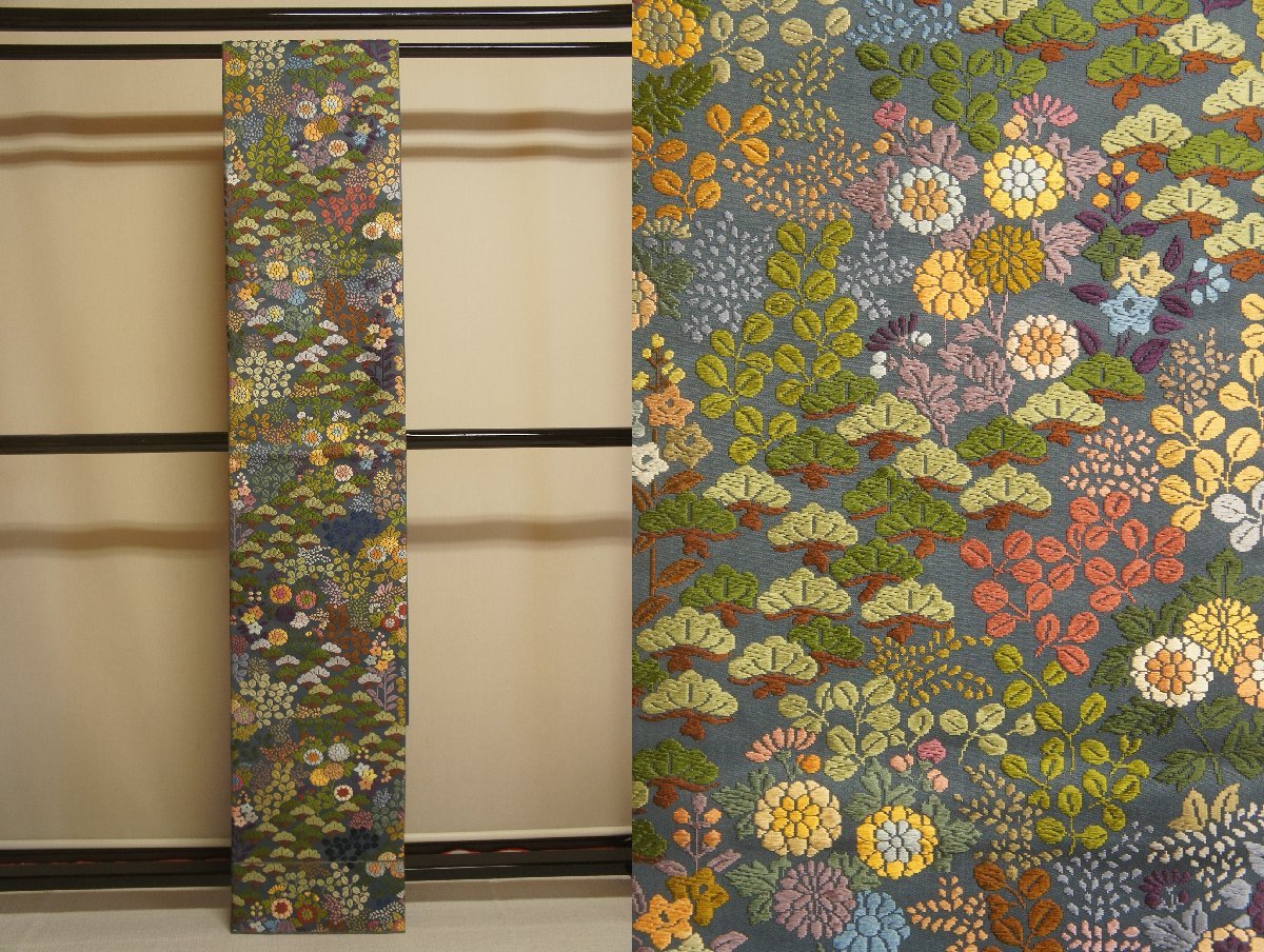 > 特選本唐織全通藍摺色地手織り能衣秋草模様袋帯[O14019]