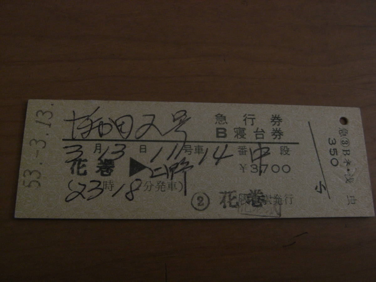- 十和田2号 急行券 B寝台券 花巻→上野 昭和53年3月13日 花巻駅発行