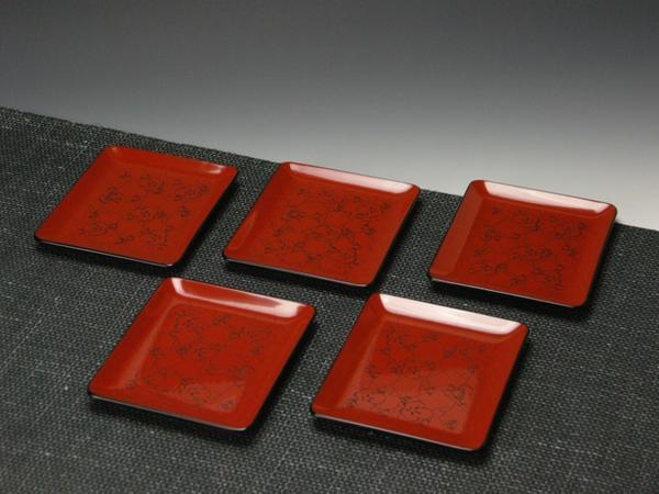 - 岡垣千舟 作 輪島塗沈金梅ちらし文銘々皿(5客)