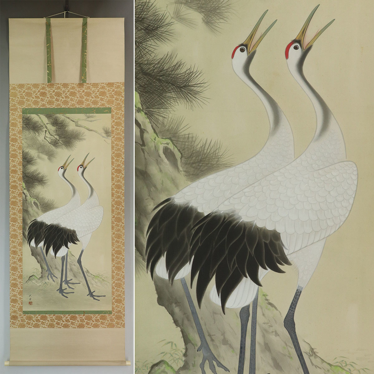 - 【真作】光峯銘【老松鳴鶴】◆絹本◆共箱◆掛軸 u06054