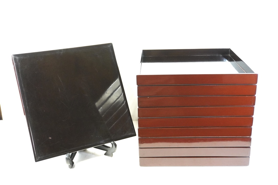 - 漆器 大正期 時代物お膳 角盆 10枚揃え 桐箱付き 24cm角 エステートセール ANS409R