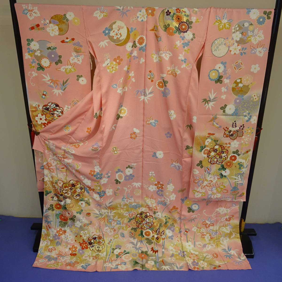 - 新品・未仕立て・正絹★本場友禅振袖★ピンク色地に宝尽しに花柄です