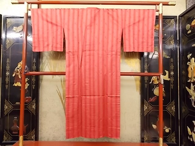 - きもの今昔4272 雨コート 正絹アンカーマークの紋織 ローズ色濃淡ぼかし縞 「鈴乃屋謹製」