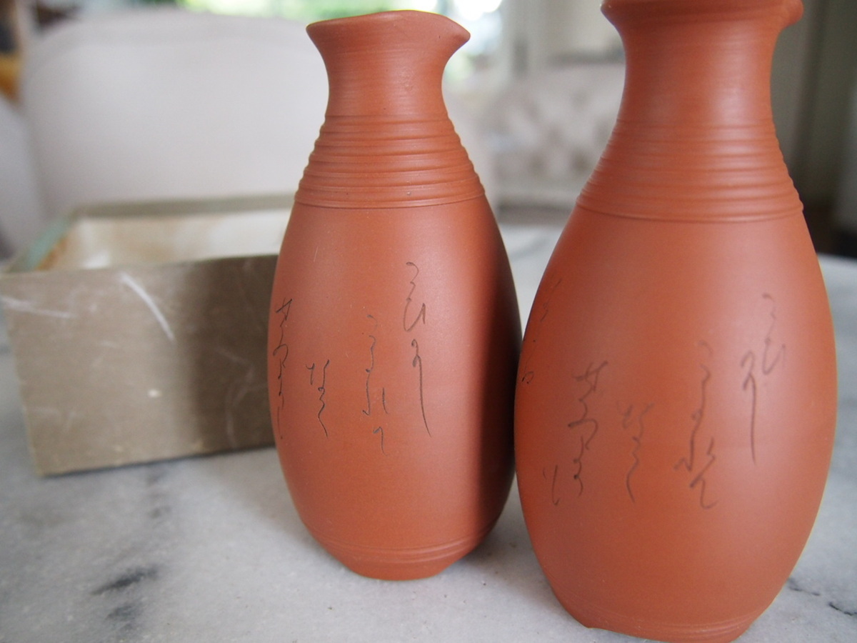 - 陶元 朱泥細字彫酒器 徳利 とっくり 2客★高さ約12.2㎝★現代工芸★細字 和歌入★お花見★花見酒★日本酒