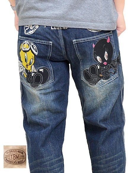 > BR×LOONEYコラボ刺繍デニムパンツ◆The BRAVE-MAN インディゴ36inch 36インチ LTB-2207 ジーンズ 加工 ルーニーチューンズ バイカー