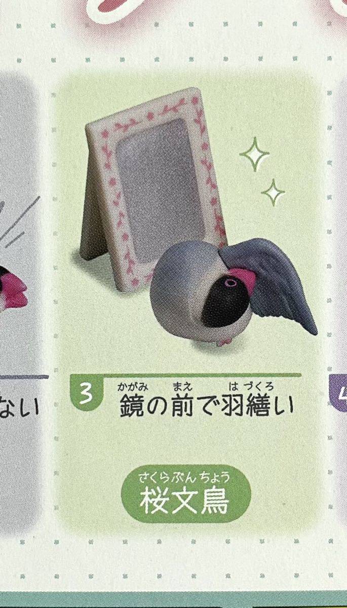 - ★鳥ミニチュアフィギュア★文鳥ライフ2 ガチャガチャ 3、鏡の前で羽繕い(桜文鳥)