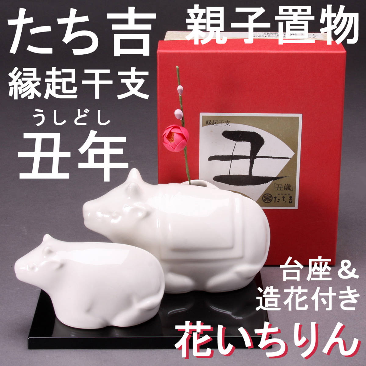 - たち吉 縁起干支 花いちりん 丑年 うし年 親子置物 白磁 台座・造花・箱付き KA-7492