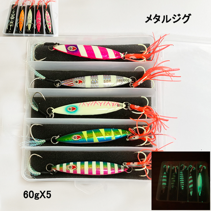 > メタルジグ 60g 5個セット 夜光フック付き スロージンキング スロージグ ハートルアー・青物・ブリ・ヒラマサ・太刀魚等に