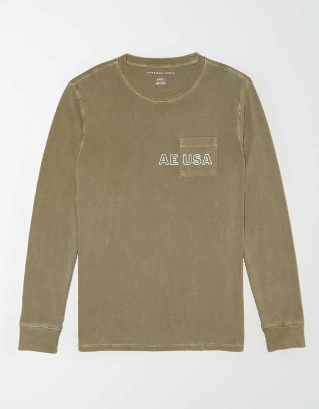 > ●送料無料●大きいサイズ American Eagle 長袖グラフィックポケットTEE (オリーブ)【USサイズ/XXXL】