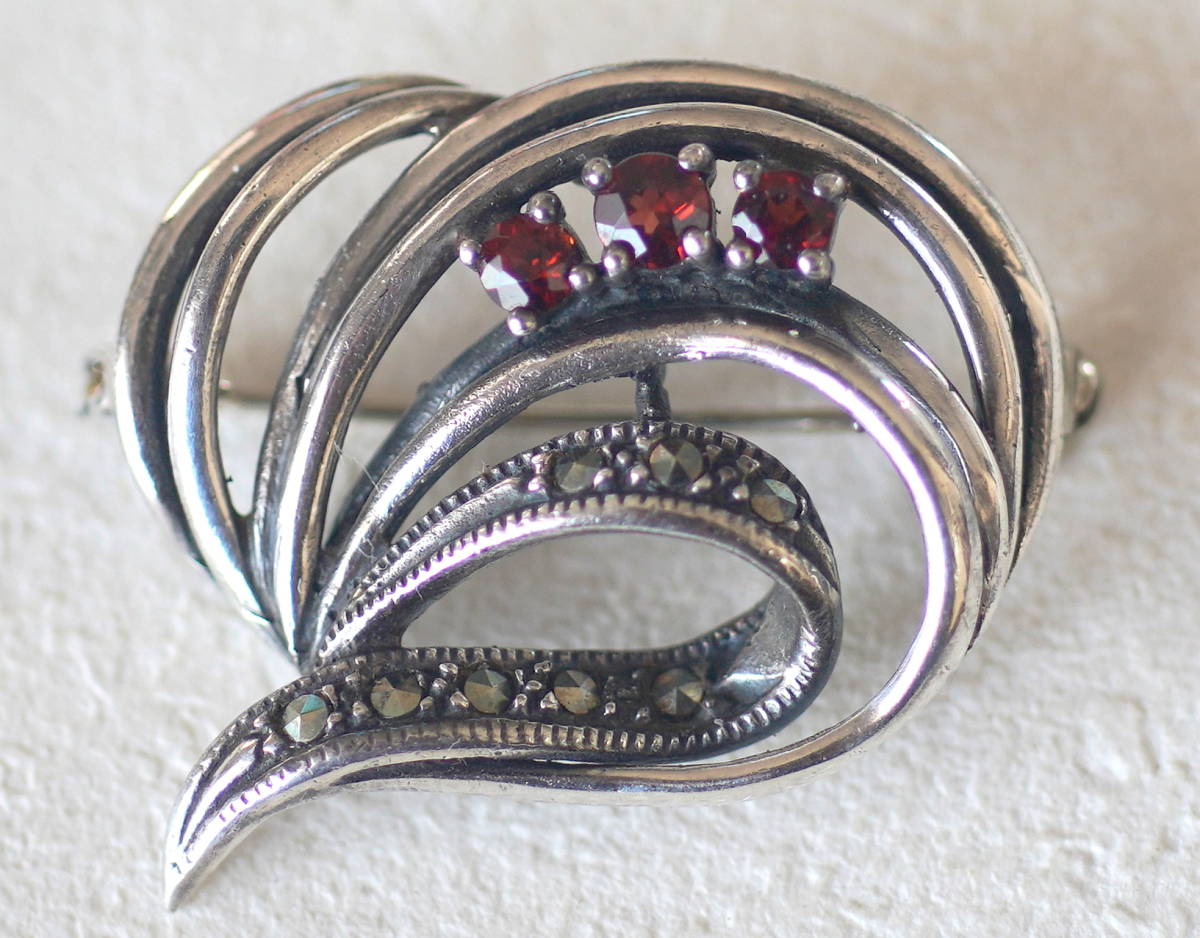 - シルバー925製 アンティーク風 ガーネットとマーカサイト付き ブローチ マルカジット