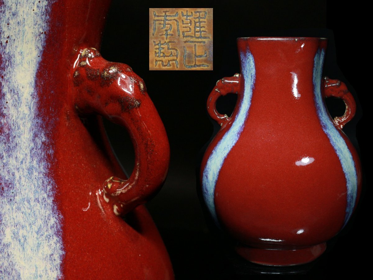 - ◆中国古玩・雍正年製・辰砂釉・双耳・花入・花瓶・唐物・高さ29㌢◆aa258