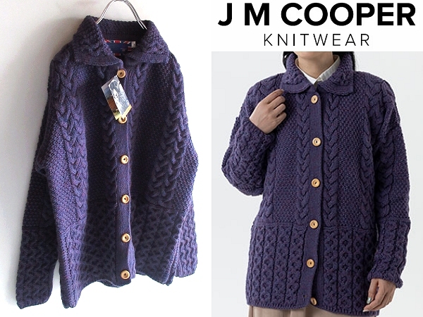 > 新品タグ付 JM Cooper Knitwear ジェイエムクーパー ウッド釦 ブリティッシュウール ケーブルニット カーディガン L パープル 紫 英国製