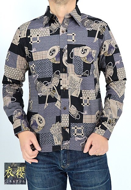 > レギュラー長袖シャツ「兜太鼓」◆衣櫻 ブラックXXLサイズ SA-1538 和柄 和風 日本製 国産 総柄