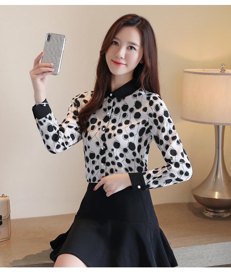 - 【ブラック水玉★L】長袖ブラウス レディース トップス 水玉プリント柄 水玉柄
