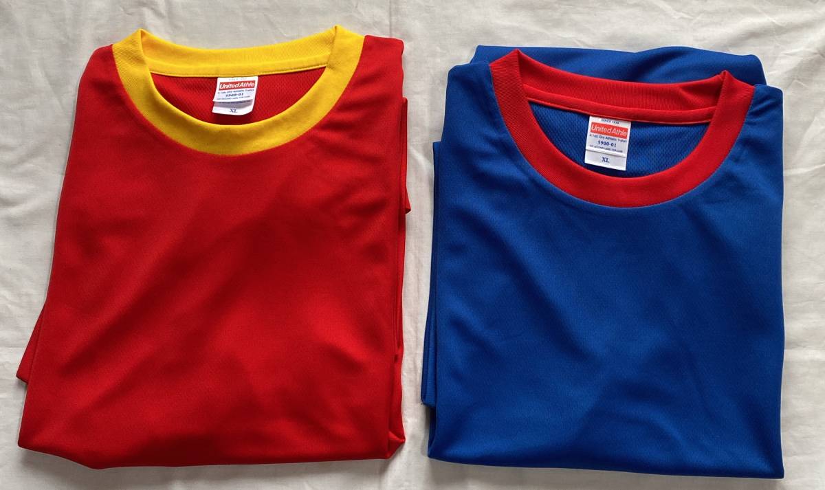 > 高級スポーツTシャツ 丸首 2着 XLサイズ ユナイテッドアスレー ブルー系 赤系 ドライ素材 UV機能 メッシュ加工%%%%未使用品