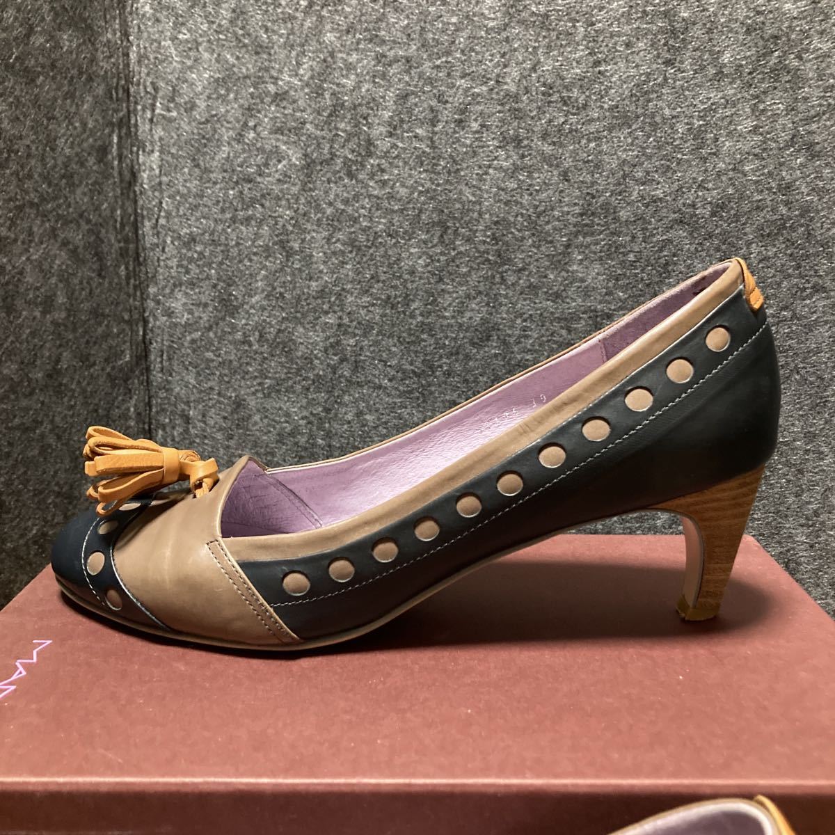- マナ MANA タッセル付きラウンドレザーコンビパンプス 39 バナナヒール 低めヒール クラシカルデザイン 本革