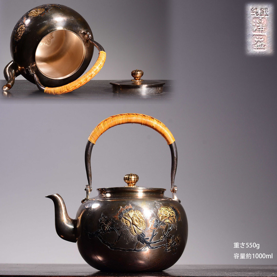 - 古銀 茶壺 浄益 造 「純銀彩金牡丹紋提梁壺」 銀瓶 煎茶 湯沸 急須 茶道具 南鐐 金工 茶器 時代物 LT-03295
