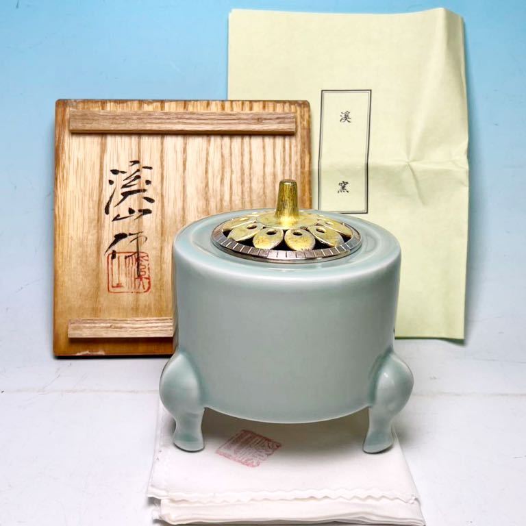 - ☆ 平安 加藤渓山 砧青瓷 香炉 蓋 金工師 加藤忠雄 作(共箱共布共栞) 香道具 青磁